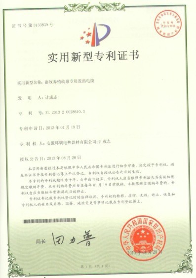 環(huán)瑞自成立研發(fā)小組至科學技術中心期間,通過獨立開發(fā),引進國外先進的生產工藝與技術,與合肥工業(yè)大學建立長期合作關系,聘請相關專業(yè)的技術專家等模式,投入大量的人力物力。我司以安全,實用性能為目標,通過改變發(fā)熱電纜結構與原材料,已研發(fā)成功。目前已獲得了關于畜牧養(yǎng)殖專用的國家專利證書,研發(fā)出耐高溫,耐磨的雙層絕緣的發(fā)熱電纜獲得了2項國家專利證書。包括之間我司獲得的“混凝土養(yǎng)護發(fā)熱電纜”“天溝融雪專用發(fā)熱電纜”,截止,我司已獲得了5項關于發(fā)熱電纜的國家專利證書,我司發(fā)熱電纜的生產技術已達到國內先進。共計19項專利。新的專利證書已下達。