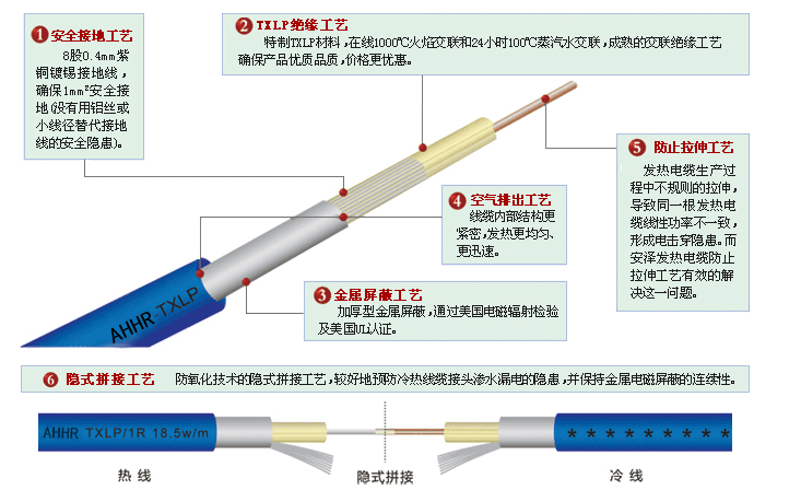 發熱電纜通電后,里面的鎳合金金屬組成的熱線發熱,并在40~60℃的低溫運行,埋設在填充層內的發熱電纜,將熱能通過熱傳導(對流)的方式和發出的8-13μm的遠紅外線輻射方式傳給受熱體。