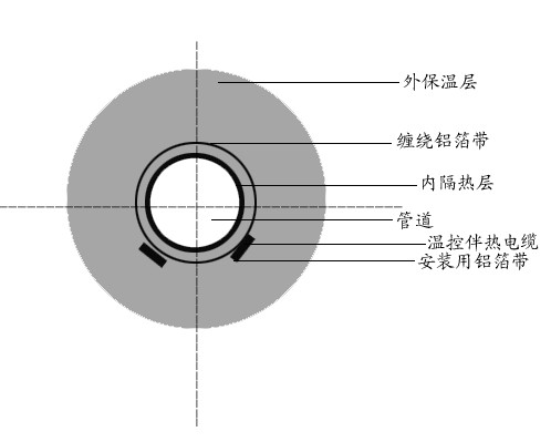 由于蒸汽掃線時(shí)間相對(duì)較短。一般控制在30分鐘左右。可采用下圖雙層保溫結(jié)構(gòu)來保證使用。一般來說,這種結(jié)構(gòu)的內(nèi)層保溫厚度為5-10mm.在內(nèi)保溫層外加包鋁膠帶,鋁膠帶上敷設(shè)自控溫電熱帶。每毫米內(nèi)層保溫層可使掃線溫度減低10℃左右,或采用隔離支架,每米1—2只,效果也較理想。當(dāng)然,在掃線時(shí)必須停止通電,管線熱損失仍按常規(guī)設(shè)計(jì),保溫層厚度只能按外層為計(jì)算厚度。