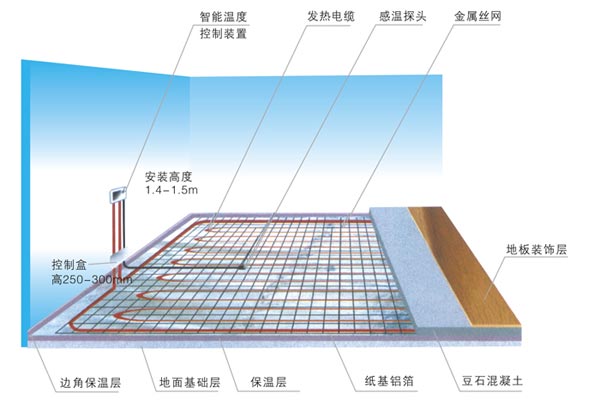 發熱電纜采暖系統可分室分戶控溫,比如說臥室,睡覺的時候氣溫低一些會比較舒適、起居室和客廳的溫度則可以稍微高一些。安徽環瑞會根據顧客的居室情況,哪個臥室是朝南、朝北,照射陽光度,包括每一個房間的形狀、每一個房間需要的溫度,再根據客戶的具體要求,通過非常專業的設計軟件幫助顧客設計出一套非常合理、而且節能健康舒適的發熱電纜采暖系統設計方案。這種先進系統可以自由控制自己想要的溫度和舒適度。