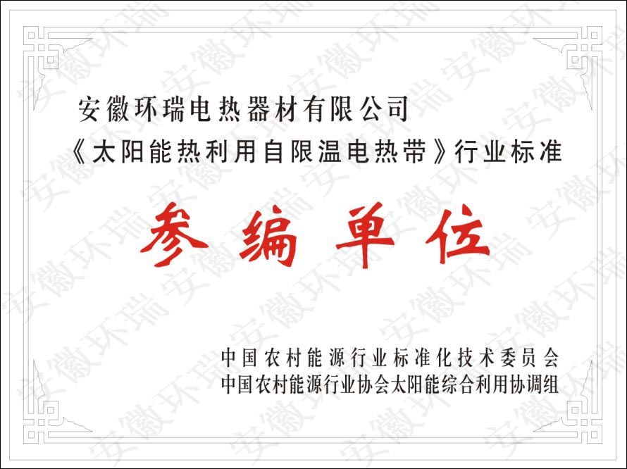 安徽環瑞電熱器材有限公司長期致力于自限溫電伴熱帶在各行業的應用,尤其是太陽能專用自限溫電伴熱帶,并研發出一種安全節能的太陽能電伴熱帶-納米阻燃本質安全型電熱帶,獲得了國家專利證書和省高新技術產品,針對目前國內層次不齊的電熱帶質量,為了規范太陽能電熱帶的市場,提高產品的質量。安徽環瑞與多家伴熱同行企業共同起草《太陽能熱利用自限溫電熱帶》,此標準由中國農村能源行業協會提出。能源行業農村能源標準化技術委員會歸口,是專門針對太陽能行業的自限溫電熱帶標準,具有重要意義。